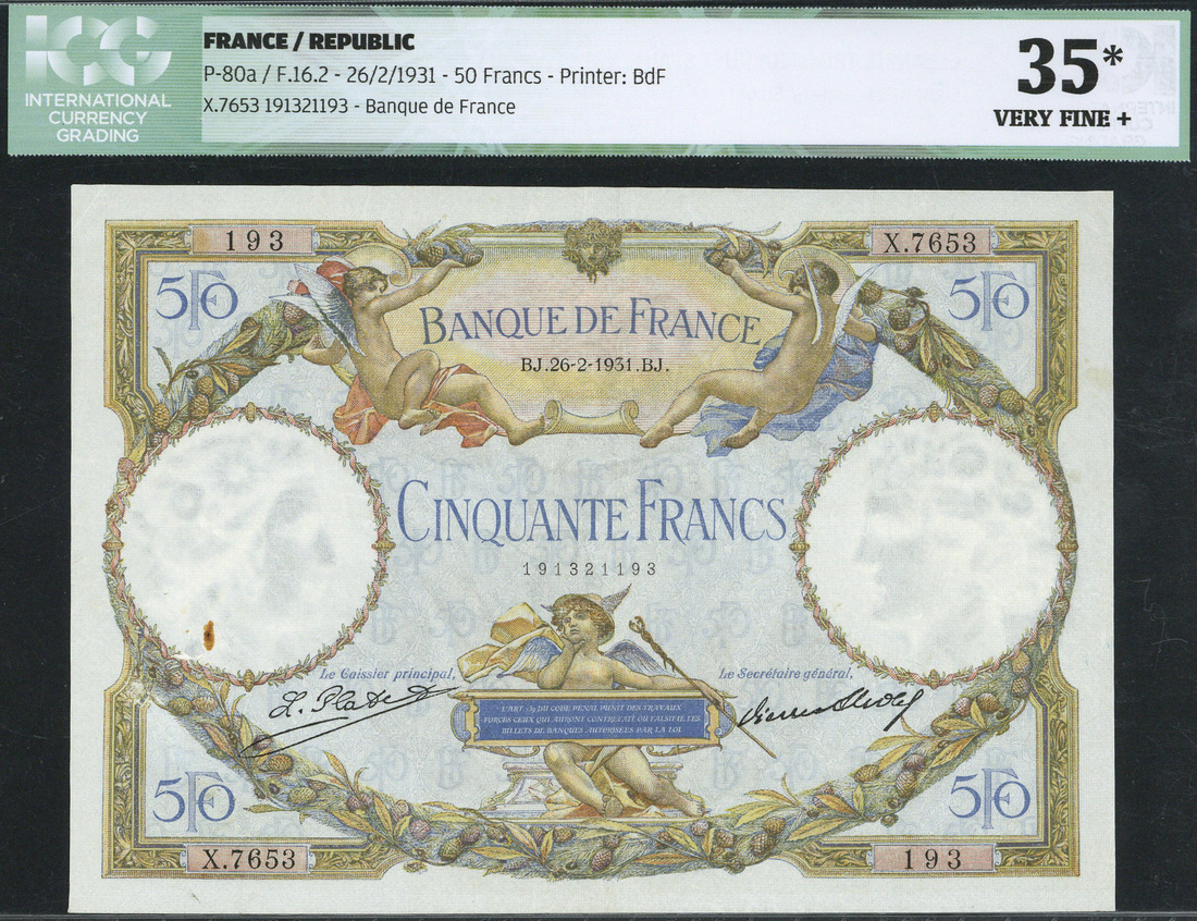 Banque de France, 50 francs, 24 November 1931, serial number X.7653 193, multicolour, Mercury at low centre, cherubs at top left and right, value at each corner