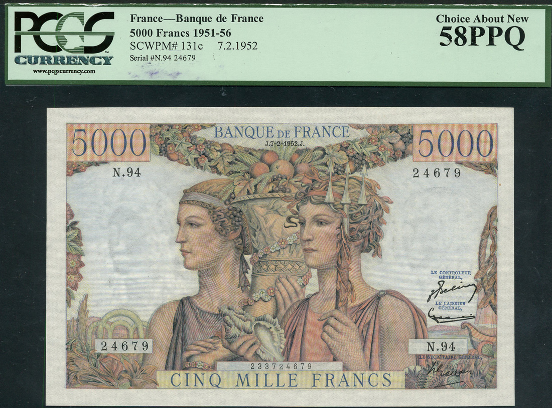 (x) Banque de France, 5000 francs, 2 January 1953, serial number N.94 24679, multicolour, two female allegories of the countryside and the ocean at centre, reverse Mercury and another female allegory at centre