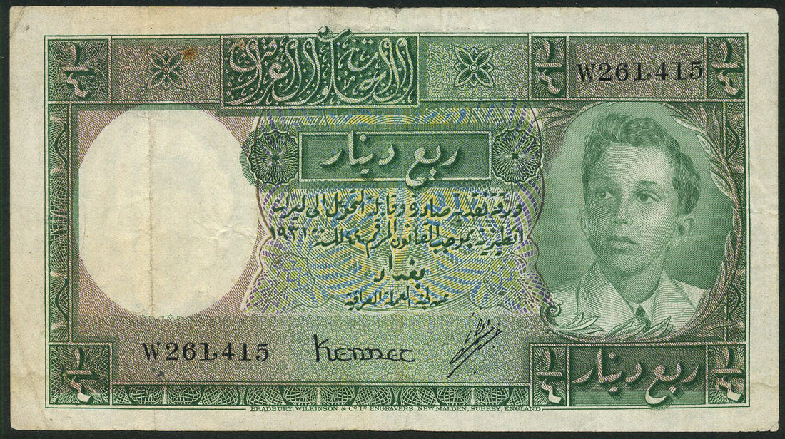 Government of Iraq, 1/4 dinar, law of 1931 (1948), serial number W261,415 pale green and lilac, King Faisal II as a youth at right, value at each corner, signatures of Kennett and al Khudairi, reverse green