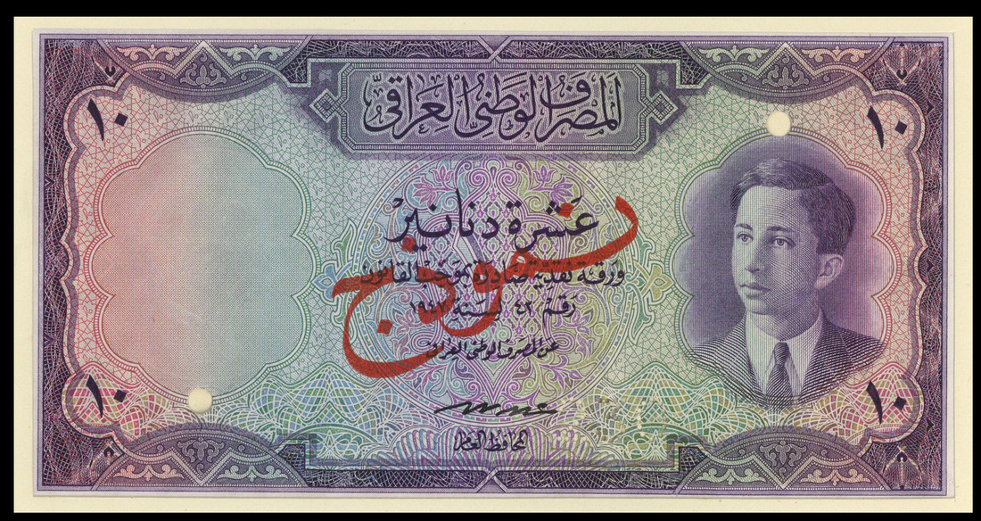 (x) National Bank of Iraq, a presentation album in blue morooco with gold title and containing a specimen set of the law of 1947 first series comprising 1/4 dinar, blue-green, 1/2 dinar, purple-brown, 1 dinar, blue, 5 dinars, red and 10 dinars, purple. All have portrait of King Faisal II as a youth at right and are signed by Abdul Ilah Hafudh. Reverse designs are date palms, the Great Mosque of Samarra, an equestrian statue of King Faisal I, Hammurabi and the scrolls and a winged bull statue respectively