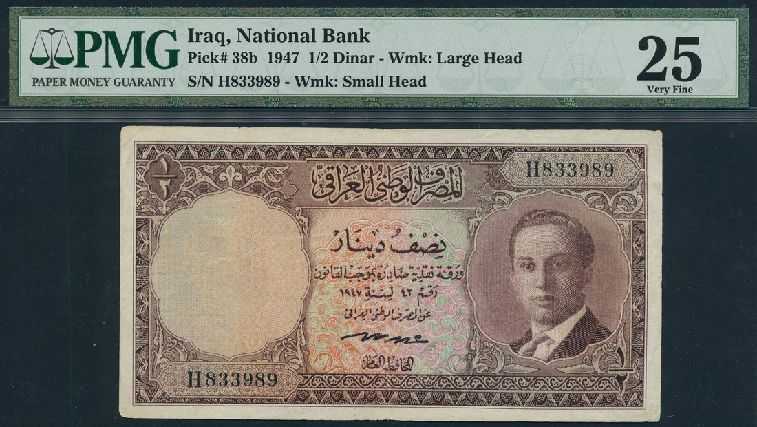 National Bank of Iraq, 1/2 dinar, 1947, serial number H833989, brown on multicolour underprint, King Faisal II as a youth at right, value at corners, reverse brown, Spiral Minaret at centre, Abdul Ilah Hafudh signature