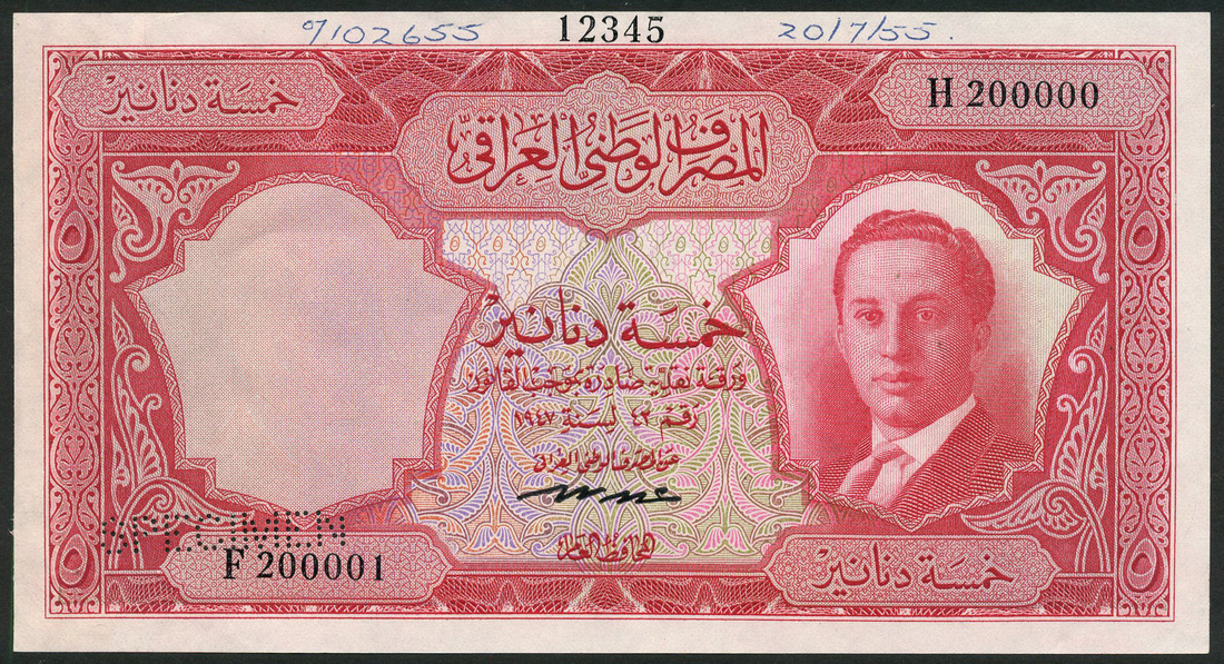 (x) National Bank of Iraq, specimen 5 dinars, law of 1947, serial number F 200001-H 200000, red and multicoloured, King Faisal II at right, value at left and right, signature of Abdul Ilah Hafud low centre, reverse red and white, King Hammurabi receiving the scrolls from the Sun God, Shamash. value at left and at each corner