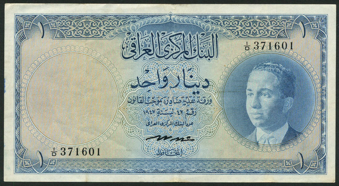 (x) National Bank of Iraq, 5 dinars, law of 1947, serial number H 656730, 1/D 371601, red, King Faisal II at right, also Central Bank, 1 dinar, law of 1947, serial number 1/D 371601, pale blue, King Faisal II at right as a young man