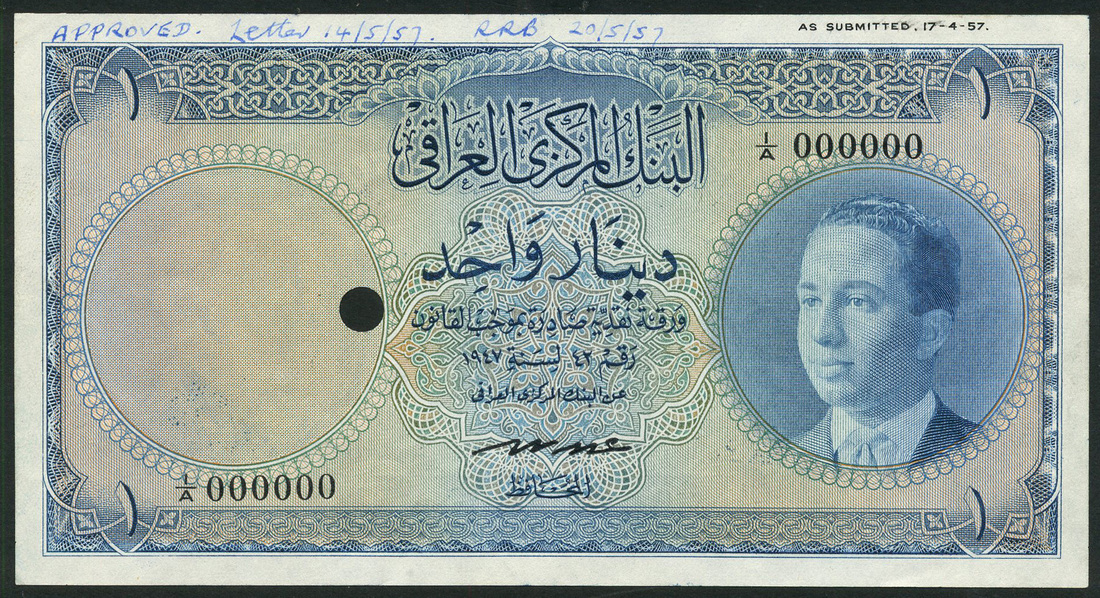 (x) Central Bank of Iraq, specimen 1 dinar, law of 1947, pale blue, King Faisal II at right as a young man, value at each corner, Hafudh signature, reverse blue, equestrian statue of King Faisal I at centre