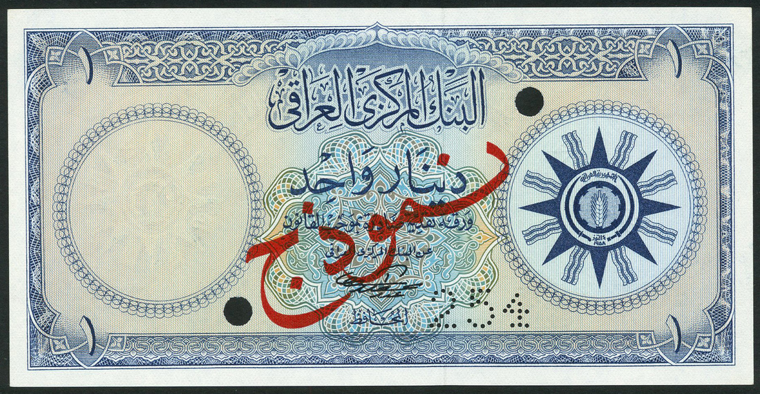 (x) Central Bank of Iraq, specimen 1 dinar, 1958 (1959), no serial numbers, blue and multicoloured, arms at right, Abdul Latif al-Shawaf signature, reverse blue, the Golden Harp of Ur at centre