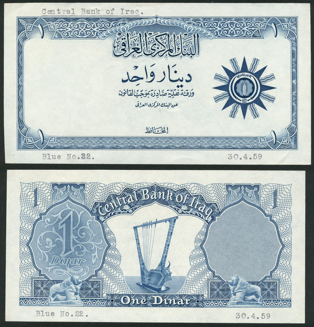 Central Bank of Iraq, obverse and reverse die proof 1 dinar, ND (1959), blue print, ornate border, value in each corner, coat arms at right, reverse blue, guilloche pattern, value at left, Lion of Babylon statues low left and right, stringed instrument at centre