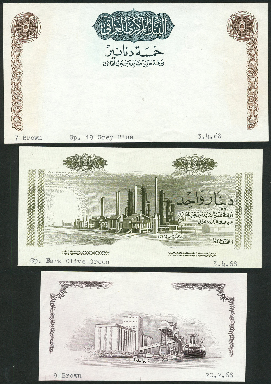 Central Bank of Iraq, a group of partial die proofs from the 1971 issue comprising obverse 1/4 dinar, brown print, Grain silos at port of Basrah, obverse 1 dinar, olive green, Aldora oil refinery buildings and towers, obverse 5 dinars, ornate border at left and right, bank title in guilloche pattern at top