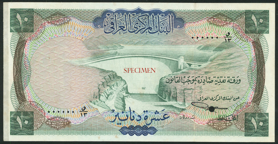 (x) Central Bank of Iraq, colour trial 10 dinars, ND (1971), zero serial numbers, green, blue and multicoloured, the Dukan Dam at centre, value at each corner, no signature, reverse green and mauve, winged bull statue at centre, value at left