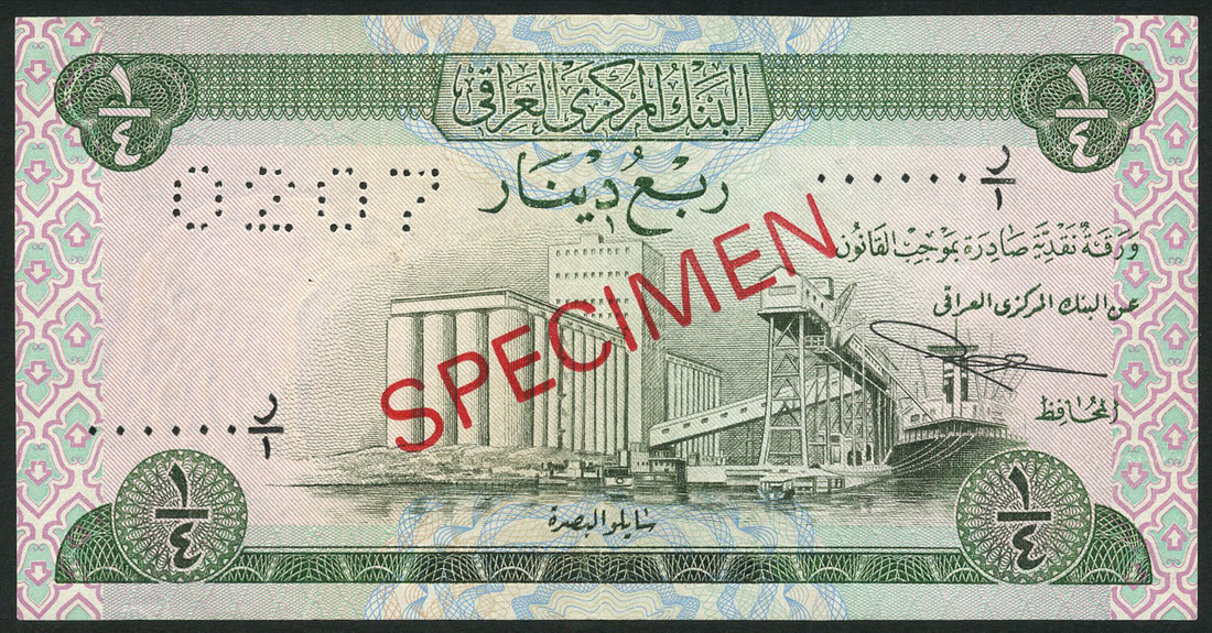 (x) Central Bank of Iraq, specimen 1/4 dinar, ND (1973), zero serial numbers, green and pink, grain silos at the port of Basrah, signature of Abdul Hassan Zalzalah at right, reverse green, palm trees at centre