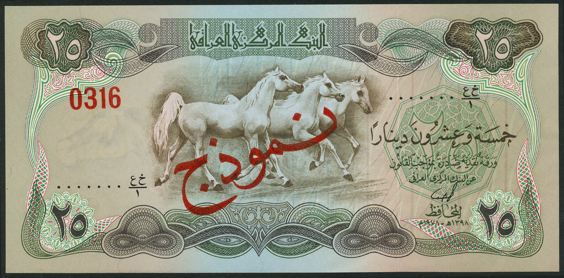 (x) Central Bank of Iraq, specimen 25 dinars, AH 1398 (1978), zero serial numbers, green and pink, horses at centre, value at each corner, signature of Fakhri Y. Kaddori low centre, reverse green, the courtyard and fountain in the Abbasid Palace in Baghdad