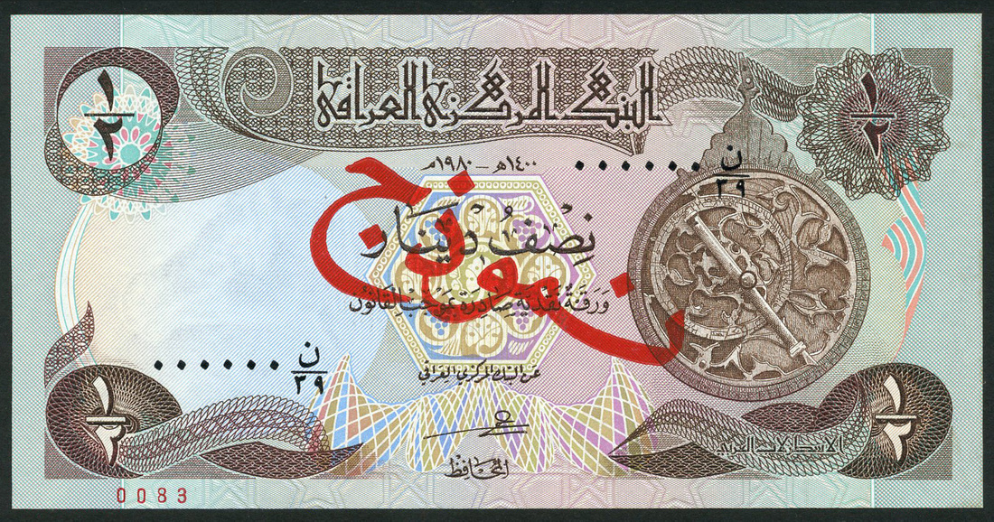 (x) Central Bank of Iraq, specimen 1/4 dinar, AH 1399 (1979), zero serial numbers, green, palm trees at centre, Iz al-din Salem signature, also specimen 1/2 dinar, AH 1400 (1980), zero serial numbers, brown, astrolab at right, Hassan al-Najafi signature