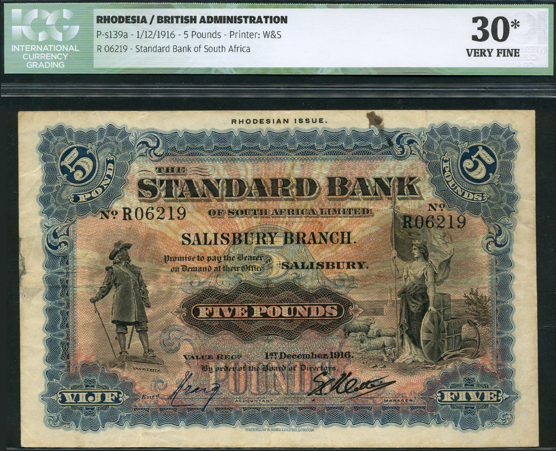 The Standard Bank of South Africa Limited, Rhodesian issue, £5, 1 December 1916, serial number R06219, blue on red and yellow underprint, Britannia with flag and shield at right, Van Riebeeck at left, value at centre and corners