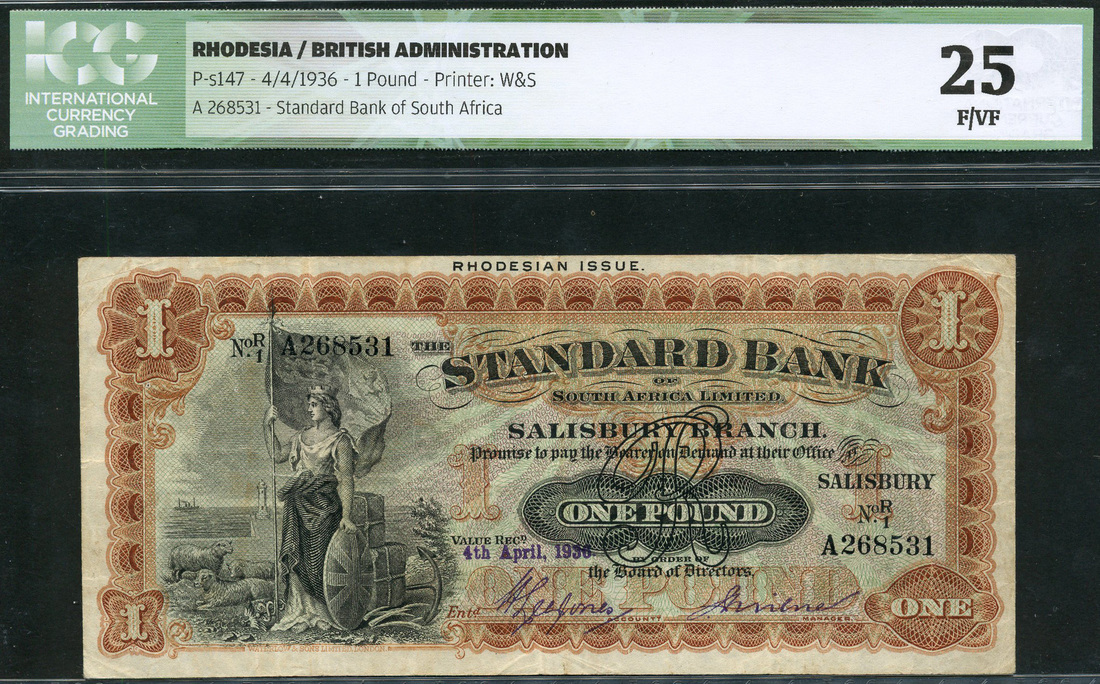 The Standard Bank of South Africa Limited, Rhodesian issue, £1, 4 April 1936, serial number R1 A268531, black and brown on pink and green underprint, Britannia with flag and shield at left, value at centre and corners