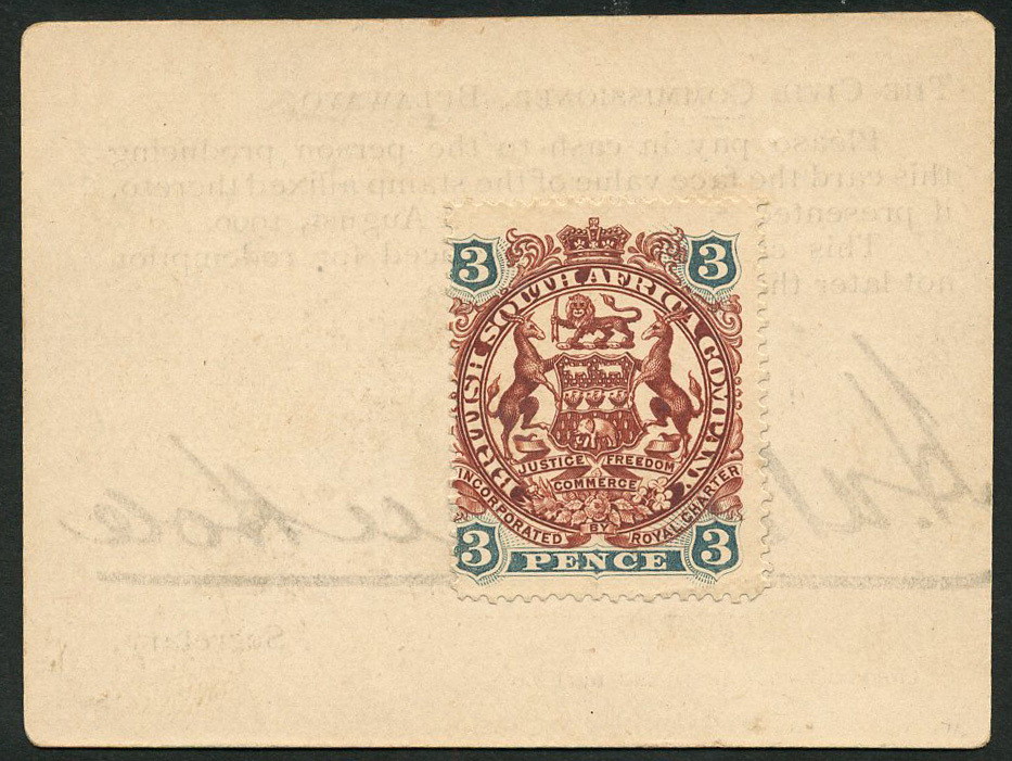 Rhodesian Postage Stamp Money, Marshall Hole, 3d stamp on pale tan card, Bulawayo, ND (9 August 1900), black text on tan, oval handstamp ADMINISTRATOR'S OFFICE and black facsimile signature of Hugh Marshall Hole, the Government secretary to Matabeleland, reverse a British South Africa Company 3d stamp of 1897 affixed at centre