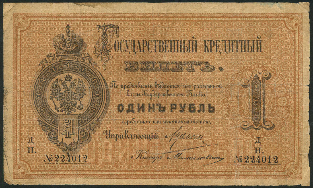 (x) Russia, State Credit Notes, 1 ruble, 1884, serial number 224012, black on brown underprint, crowned arms at left, value at right, reverse black, arms at left and right