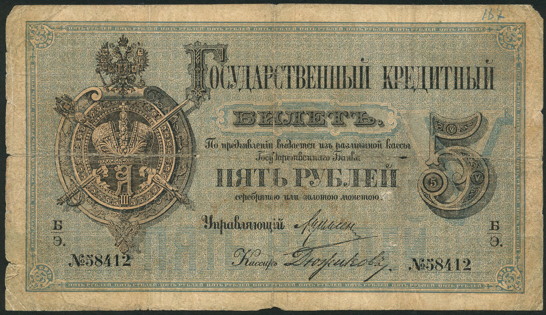 (x) Russia, State Credit Notes, 5 rubles, 1884, serial number 58412, black on blue underprint, crowned arms at left, value at right, reverse black, D. Ivanovich Donskoi at centre