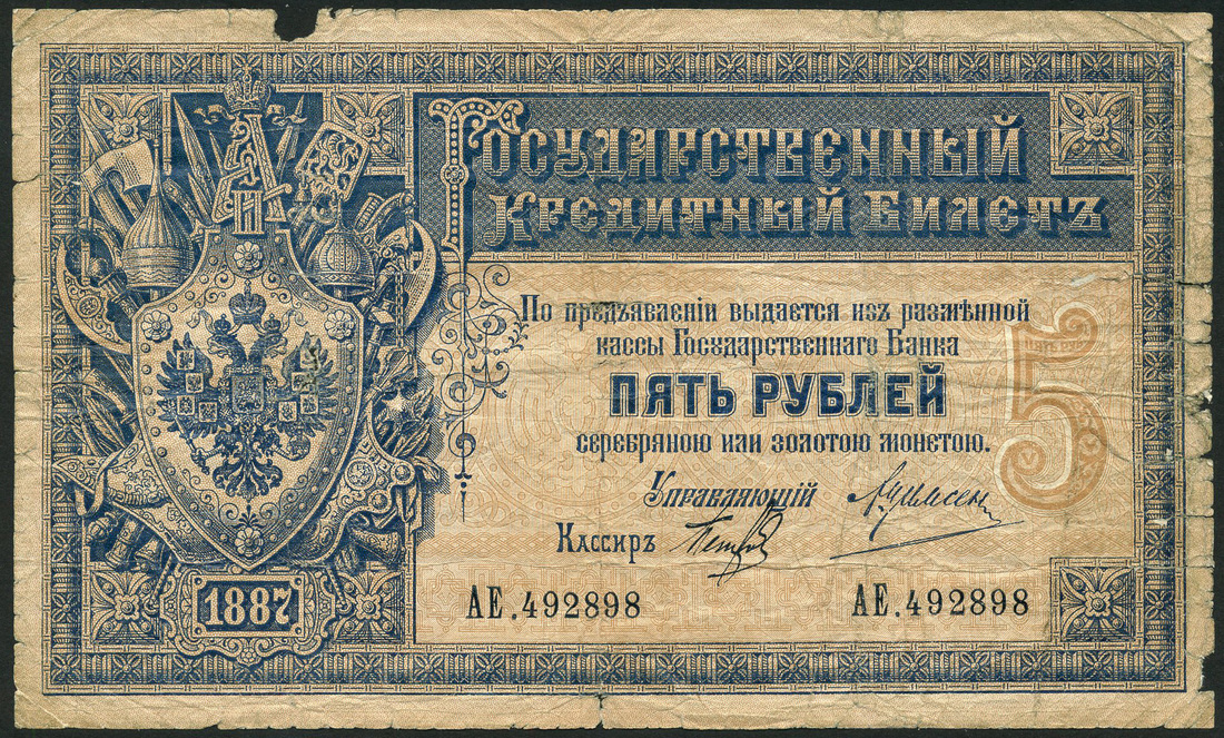 (x) Russia, State Credit Notes, 5 rubles, 1887, serial number 492898, blue on tan underprint, arms and weapons at left, reverse with arms at centre