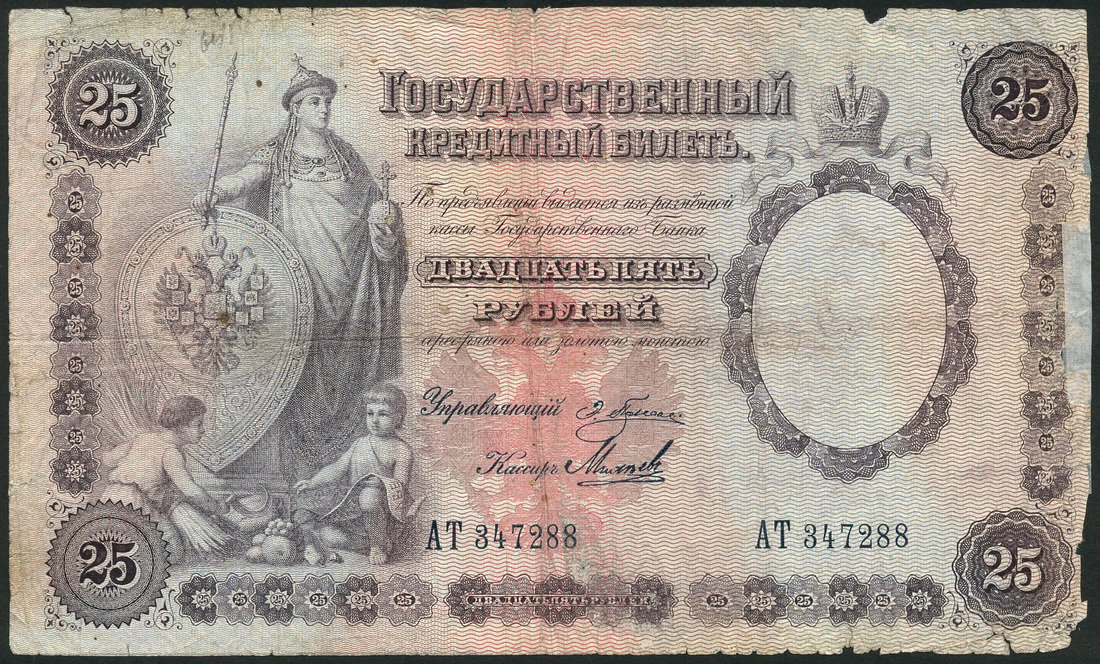 (x) Russia, State Credit Notes, 25 rubles, 1892, serial number 347288, lilac, allegory of Russia, with two children, at left, value at corners, reverse blue and purple, six female heads at right