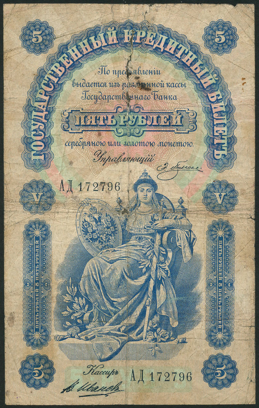 (x) Russia, State Credit Notes, 5 rubles, 1895, serial numbers A172796, blue on red and green underprint, allegory of Russia at centre, reverse blue, women at corners