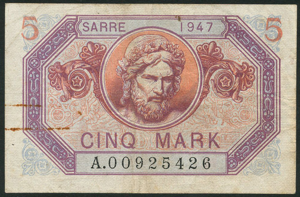 (x) Saar, Treasury issue, 5 francs, 1947, serial number A00925426, red and purple, on blue underprint, classical male head at centre, value at top left and right