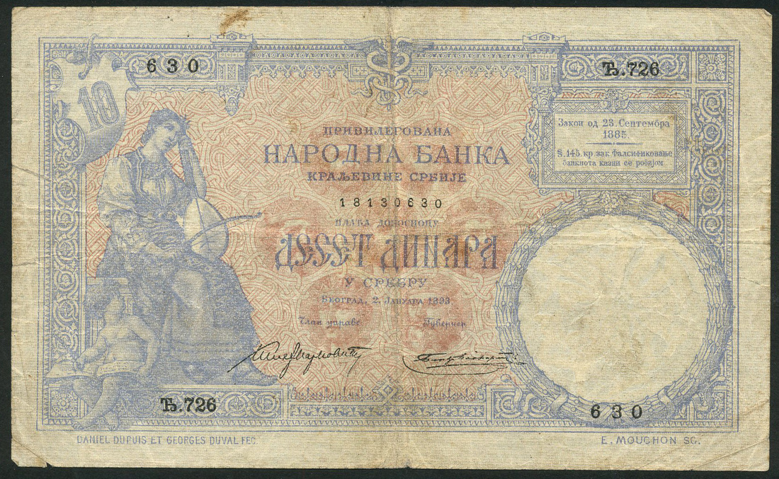 (x) Chartered National Bank of the Kingdom of Serbia, 10 dinara, 2 January 1893, serial number 726 630, blue on red-brown underprint, woman and child at left, value at top left, kings heads in underprint