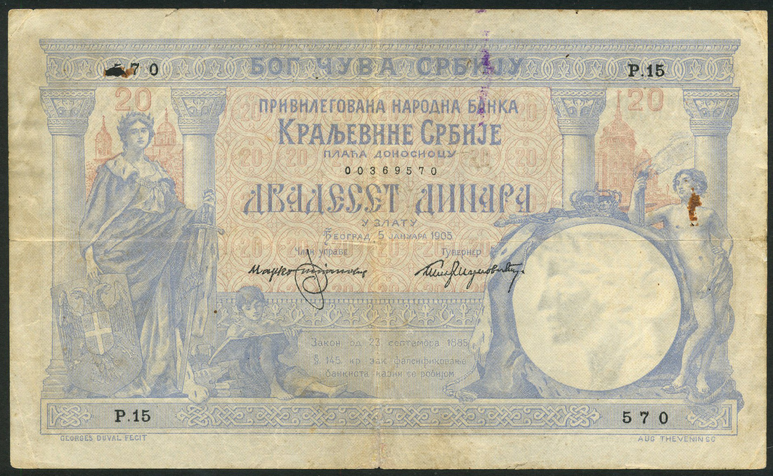 (x) Chartered National Bank of the Kingdom of Serbia, 20 dinara, 5 January 1905, serial number P.15 570, blue pm brown underprint, female allegory of Serbia with seated child at left, young woman at right, reverse blue, reverse blue, blacksmith and family at centre