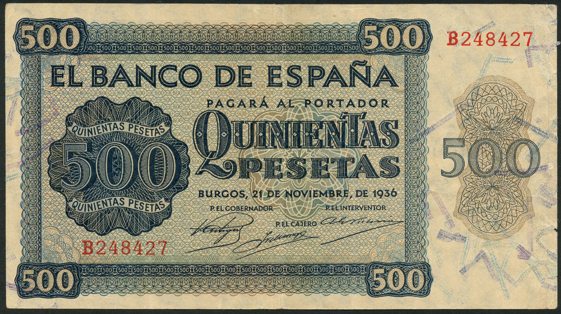(x) El Banco de Espana, 500 pesetas, 21 November 1936, serial number B248427, blue on multicolour underprint, values at left, right and corners, reverse Cathedral of Salamanca, also 100 pesetas, 1936, green