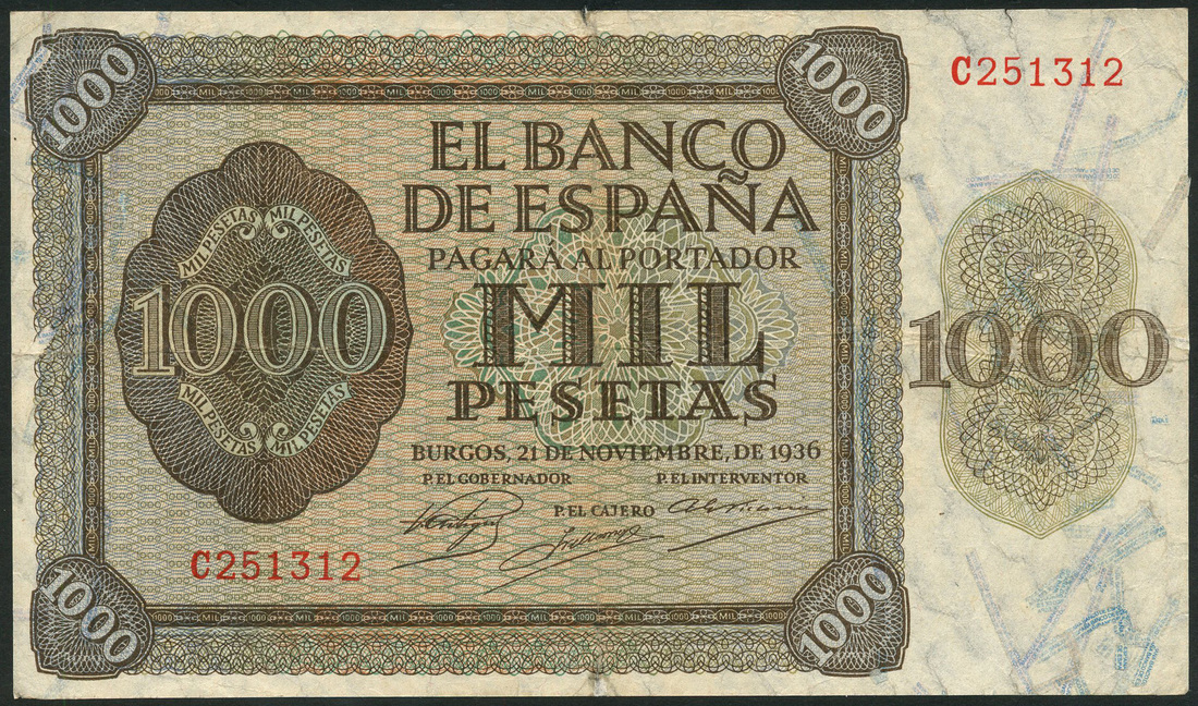 (x) El Banco de Espana, 1000 pesetas, 21 November 1936, serial number C251312, brown on multicolour underprint, values at left, right and corners, reverse single arch stone bridge at centre