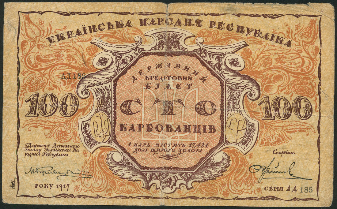(x) Ukrainian National Republic, 100 karbovantsiv, 1917, serial number A185, brown on tan and yellow underprint, value at left and right, reverse inverted, blue and green