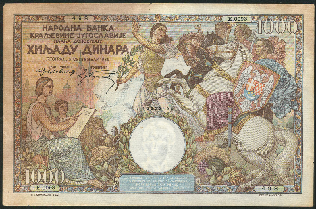 (x) National Bank of Yugoslavia, 100 and 1000 dinara, 1934-35, serial numbers M.0427 866 and E.0093 498, multicoloured, male and female allegories with weapons and animals