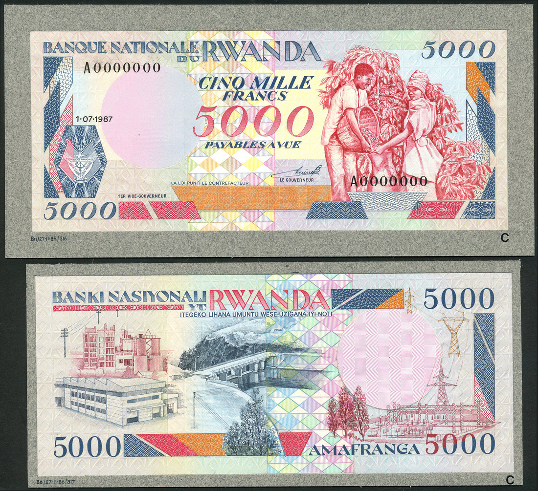 (x) Bank Nationale du Rwanda, an obverse and reverse composite essay for a 5000 francs, 1 July 1987, serial number A 0000000, red and multicoloured, harvest collecting scene at right, arms low left, reverse multicoloured, industrial scenes