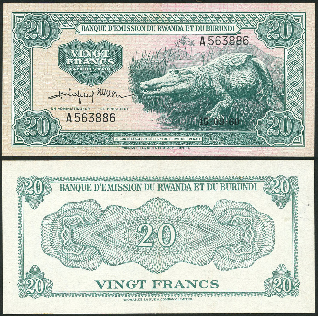 (x) Banque d'Emission du Rwanda et du Burundi, 20 francs, 15 September 1960, prefix A, green and pale pink, crocodile at right, reverse green and white