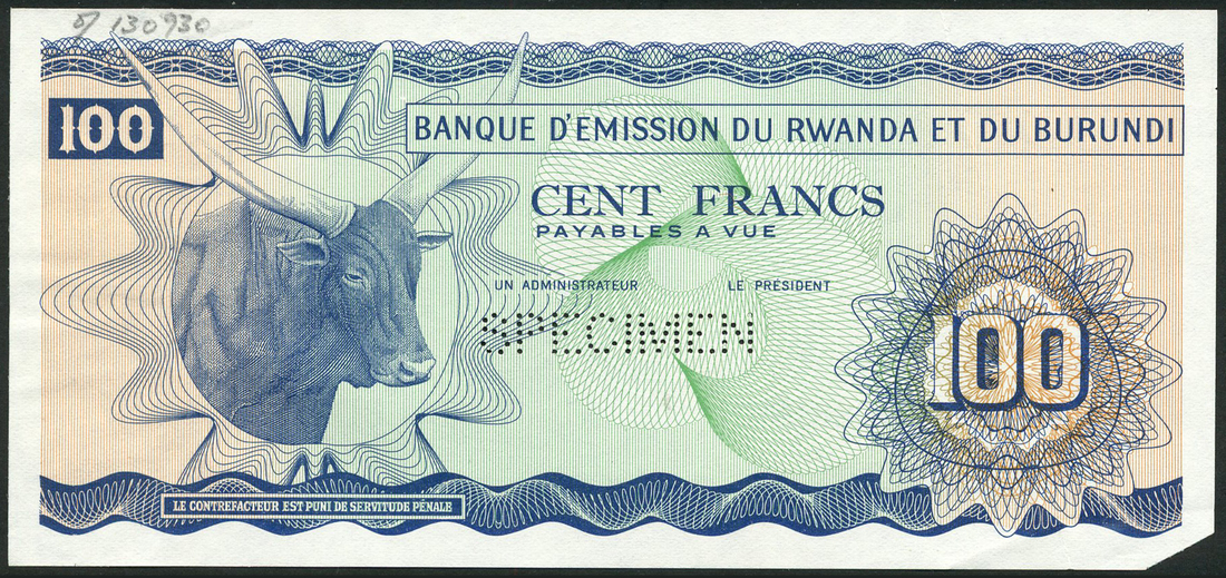 (†) Banque d'Emission du Rwanda et du Burundi, specimen proof 50 Francs, ND (1960), no serial numbers, specimen 50 Francs, 15 September 1960, serial number A 000000, both red and multicoloured, lioness at centre right, reverse value set in geometric patterns; also specimen proof 100 Francs, ND (1960), no serial numbers, blue on pale green and tan underprint, zebu at left, reverse value set in geometric patterns, the first and third perforated SPECIMEN, the second overprinted SPECIMEN diagonally in red on obverse and horizontally on reverse, one punch hole