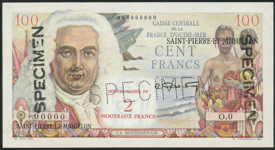 Caisse Centrale de la France d'Outre-Mer, Saint Pierre et Miquelon, specimen 100 francs, 'La Bourdonnais', ND (1946), zero serial numbers, red and multicoloured, La Bourdonnais at left, local couple at right, Postel-Vinay signature, reverse red and multicoloured, girl at right, mountain at left, black SPECIMEN overprint, perforated