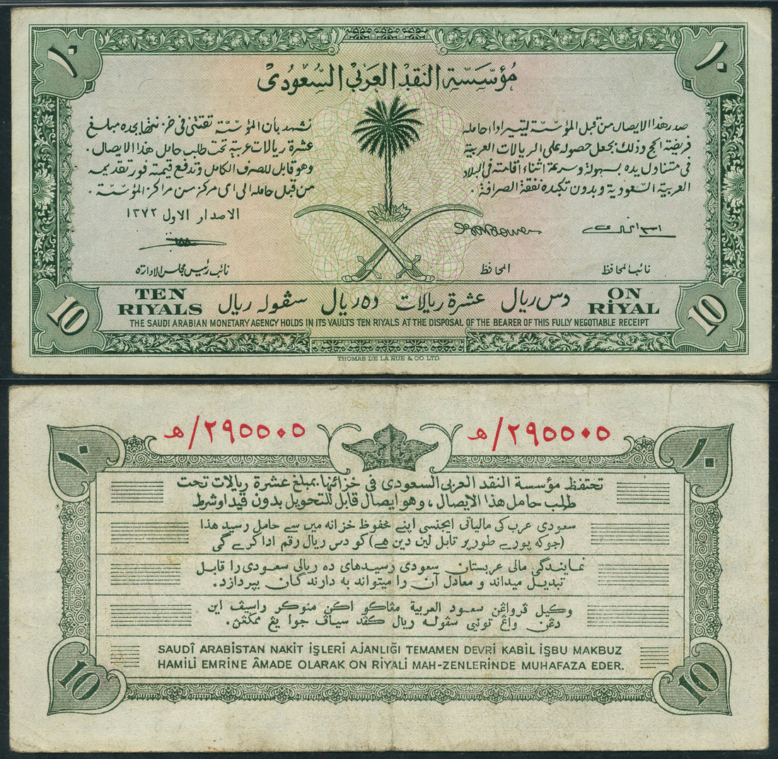 (x) Saudi Arabian Monetary Agency, Haj Pilgrim receipt issue, 10 riyals, 1953, serial number H 295505, green, dhows in Jedda harbour at centre, reverse arms at left and right