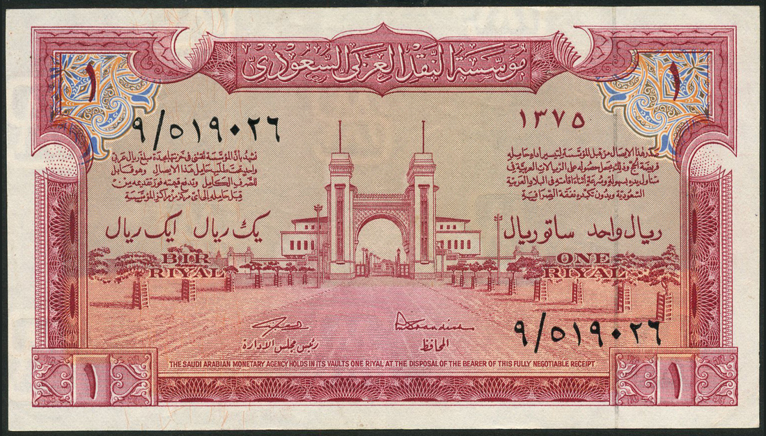 (x) Saudi Arabian Monetary Agency, 1 riyal, AH 1375 (1956), 9/519026, red and multicoloured, King Saud's Palace at centre, Standish and al-Saban signatures