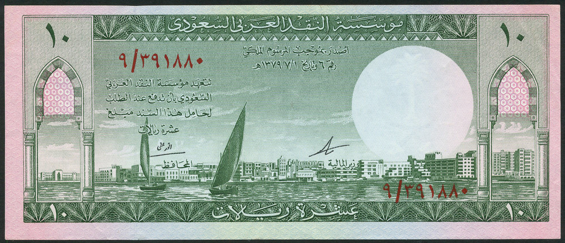 (x) Saudi Arabian Monetary Authority, 10 riyals, ND (1963), serial number 9/391880, green on pale pink, two sailing boats with Jiddah harbour in background, reverse, national emblem of palm tree and two crossed swords at centre
