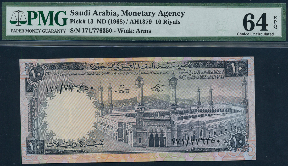 (x) Saudi Arabian Monetary Authority, 10 riyals, ND (1968), serial number 171/776350, blue-grey, the Holy Mosque in Mecca right centre, value at each corner, reverse grey-blue, the al-Massa wall
