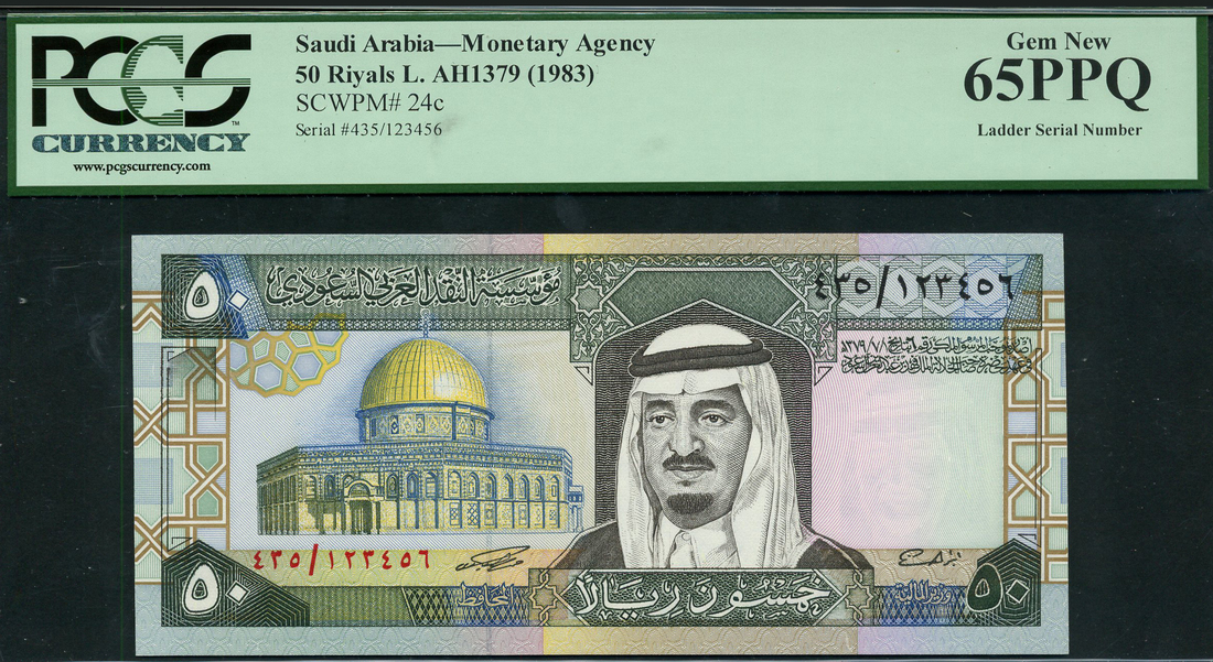 (x) Saudi Arabian Monetary Agency, 1 riyals, 1984, serial number 2291/123456, brown and multicolour, 5 riyals, 1983, 263/123456, purple and multicolour, 50 riyals, 1983, serial number 435/123456 all with King Fahd at centre, Hamad Saud al-Sayyari signature, 20 riyals, 1999, 106/444444