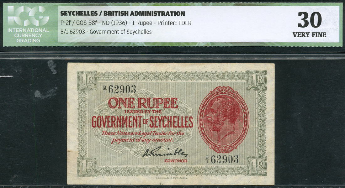 Government of Seychelles, 1 rupee, ND (1936), serial number B/1 62903 grey, value and text in red, head of George V in oval frame at right, signature of Sir Arthur Francis Grimble