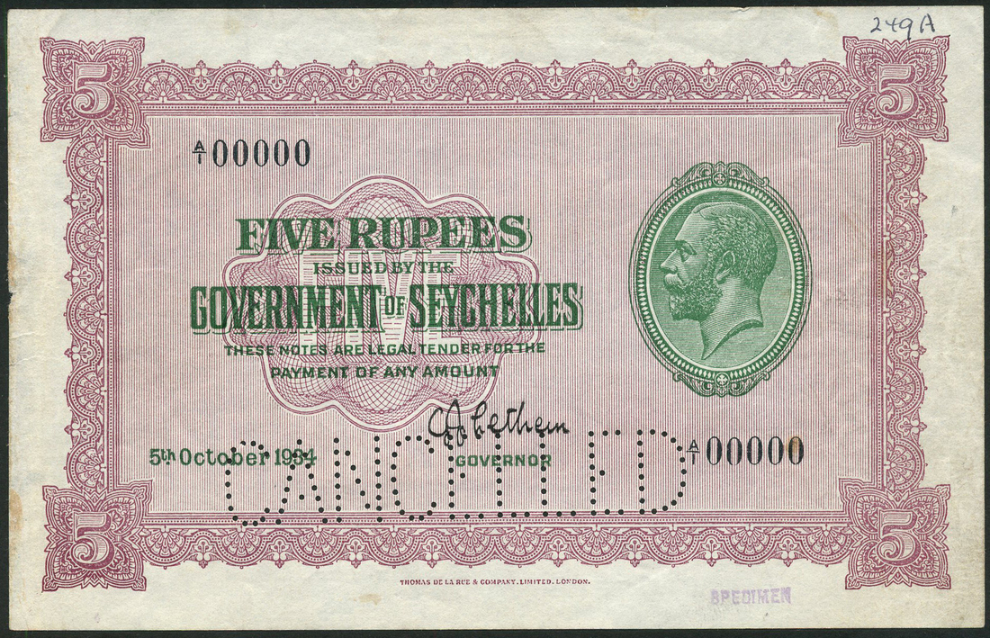 (†) Government of Seychelles, specimen $5, 5 October 1934, serial number A/1 00000, uniface, green and mauve, George V at right, value at corners, small purple SPECIMEN stamp and large CANCELLED perforation