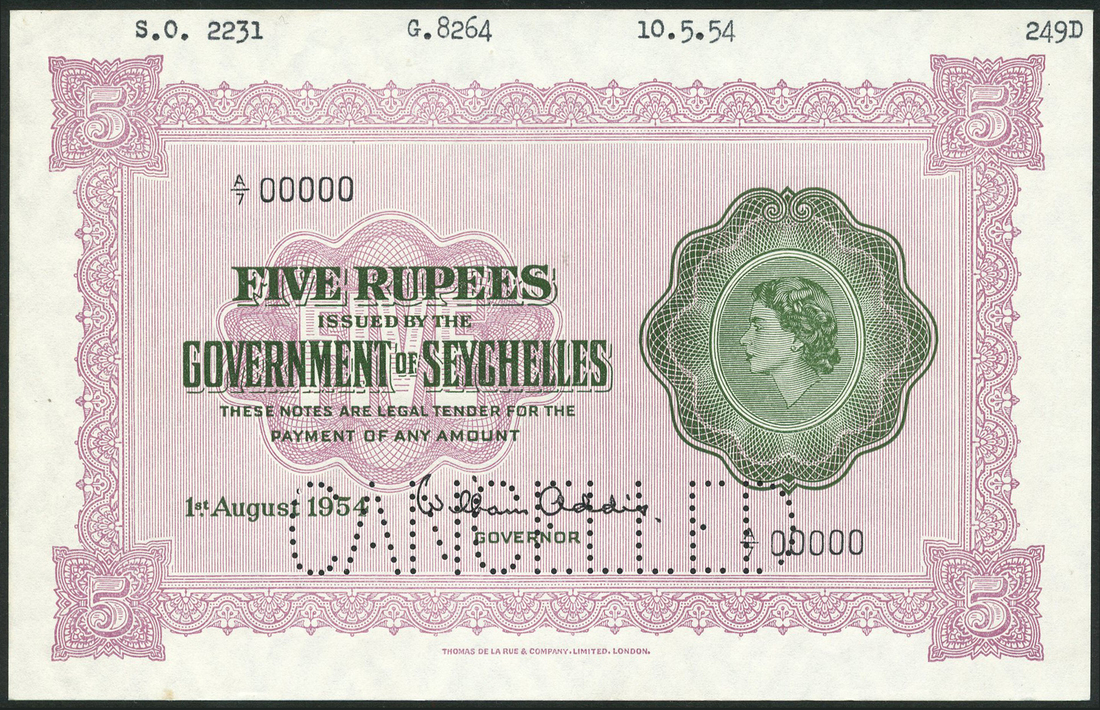 (†) Government of Seychelles, specimen $5, 1 August 1954, serial number A/7 00000, green and mauve, Elizabeth II at right, value at corners, reverse mauve, arms at top centre, large CANCELLED perforation