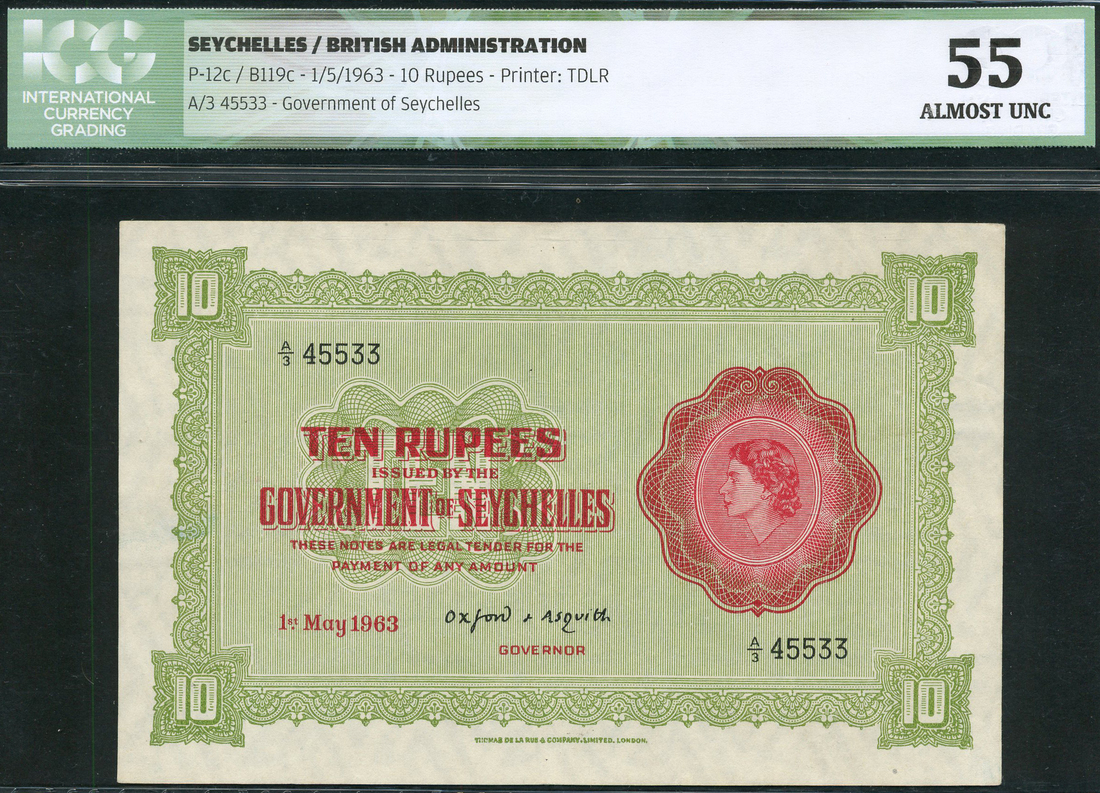 Government of Seychelles, 10 rupees, 1 January 1967, serial number A/3 45533, green underprint, oval vignette of Elizabeth II in red at right, value in red at left, value at each corner, signature of the Earl of Oxford and Asquith low centre, reverse blank