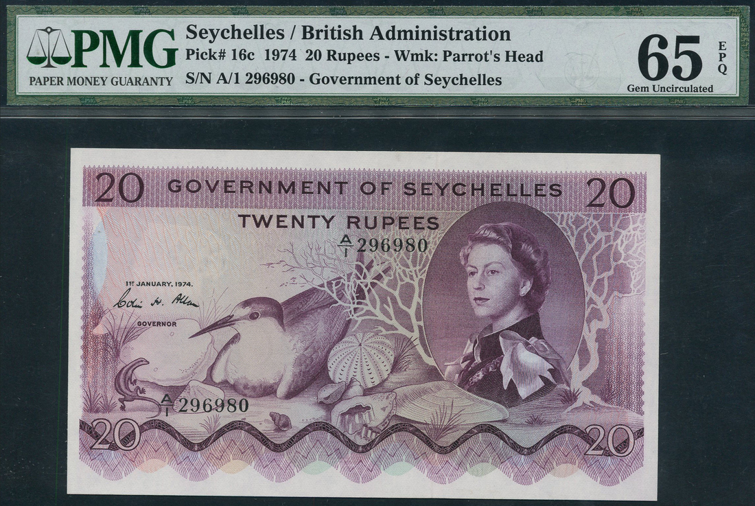 (x) Government of Seychelles, 20 rupees, 1 January 1974, serial number A/1 296980, mauve on multicolour, Sooty tern bird at left, Elizabeth II at right, reverse mauve, guilloche pattern, Colin Hamilton Allan signature