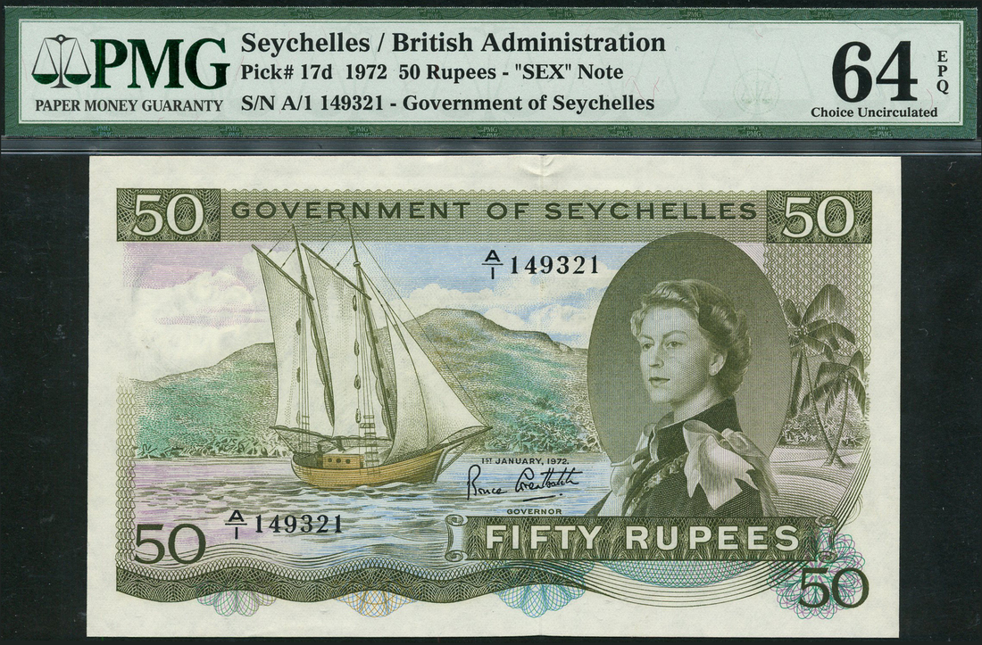 (x) Government of Seychelles, 50 rupees, 1 January 1972, serial number A/1 149321, olive green and blue on multicolour underprint, Elizabeth II at right, schooner at left