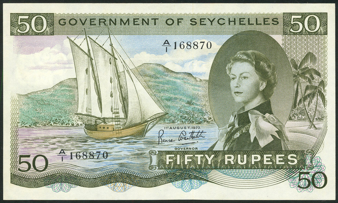 Government of Seychelles, 50 rupees, 1 August 1973, serial number A/1 168870, green, Elizabeth II at right, yacht at centre, Greatbatch signature