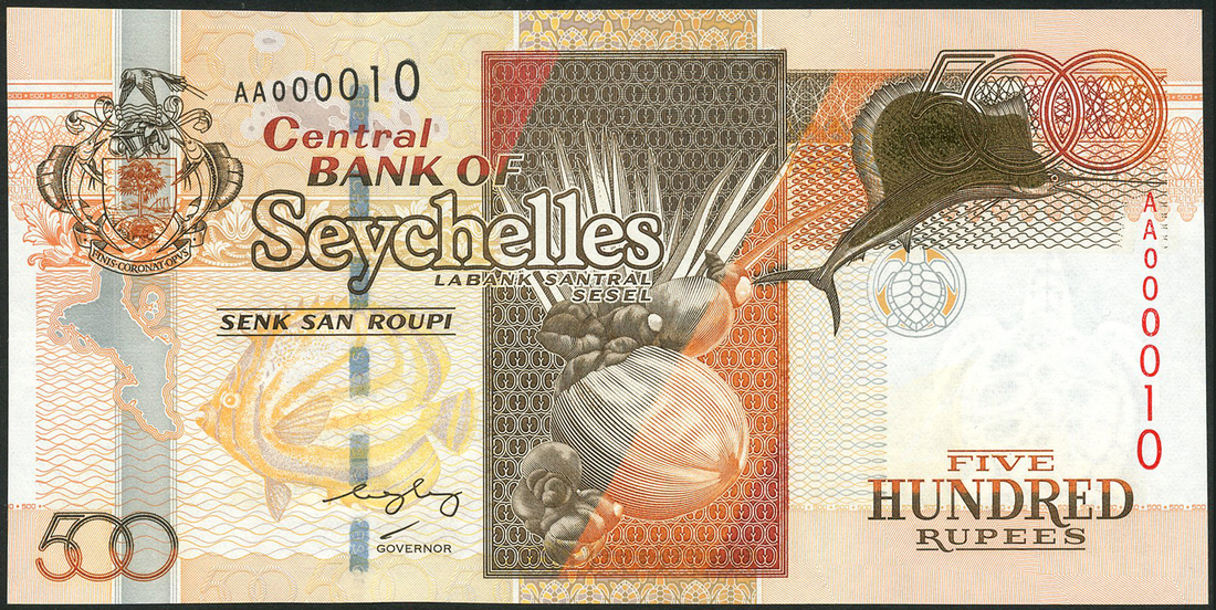 (x) Central Bank of Seychelles, $500 rupees, 2005, serial number AA 000010, brown and orange, Coat of arms at top left, coco-de-mer palm, gold foil sailfish. reverse tan, Central Bank of Seychelles headquarters