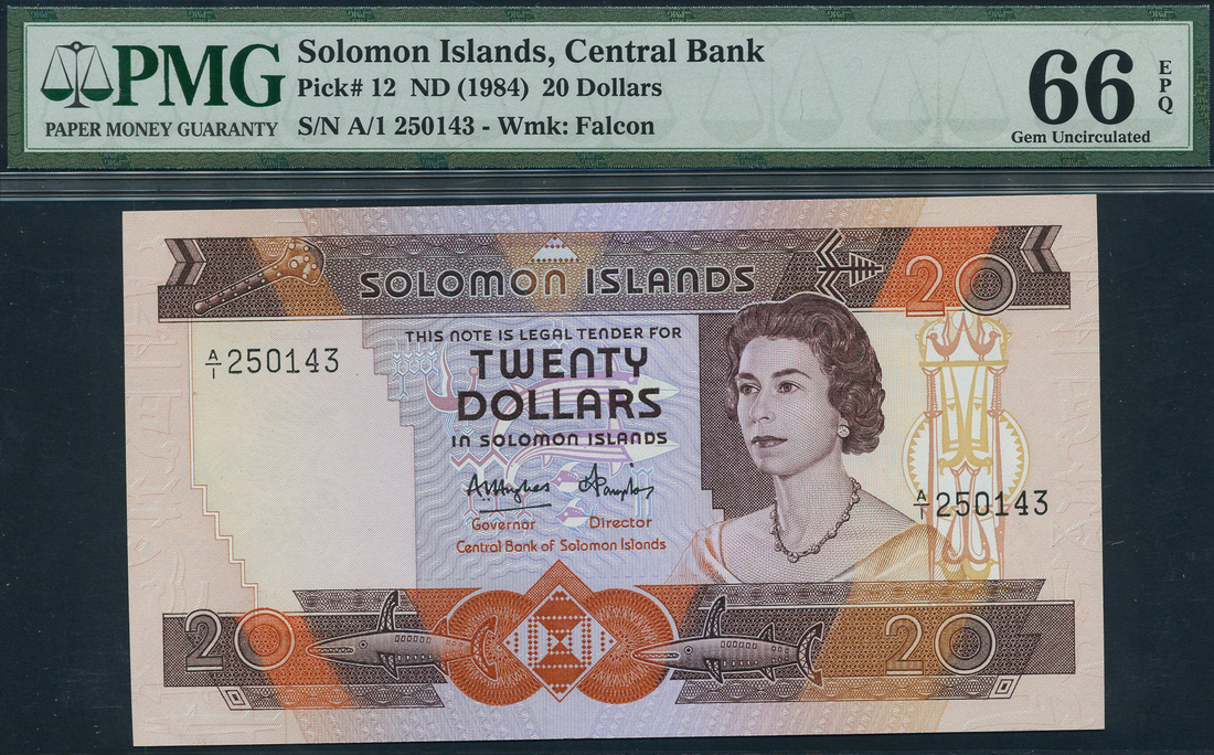 (x) Central Bank of Solomon Islands, $20, ND (1984), serial number A/1 250143, brown, orange and purple, Elizabeth II at right, reverse brown, warrior tribe