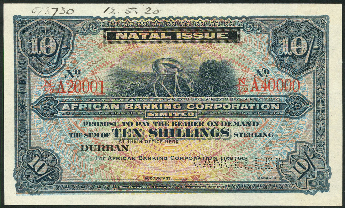 (†) African Banking Corporation, Natal Issue, specimen 10 shillings, Durban, ND (1920), serial range N/½ A20001- N/½ A40000, blue on multicolour underprint, springbok grazing top centre, value in each corner and at centre, reverse, green and orange, map of South Africa in ornate frame at centre
