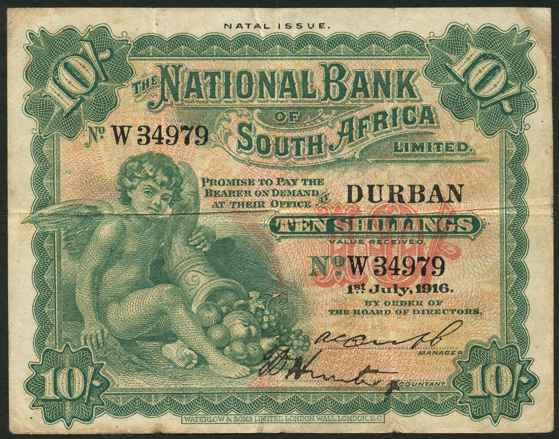 National Bank of South Africa Limited, 10 shillings, Durban, 1 July 1916, serial number W 34979. green and pale pink-red, value in pink at right, cherub and cornucopia at left, manuscript and printed signature low right, reverse mauve, impala at centre, value at left and right